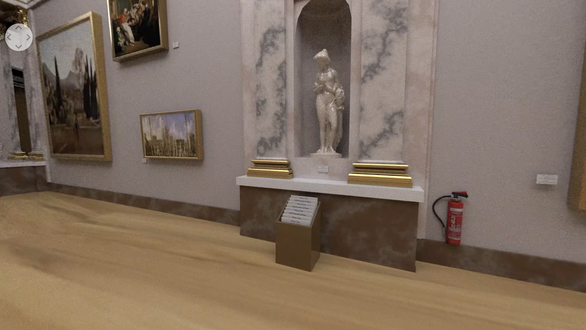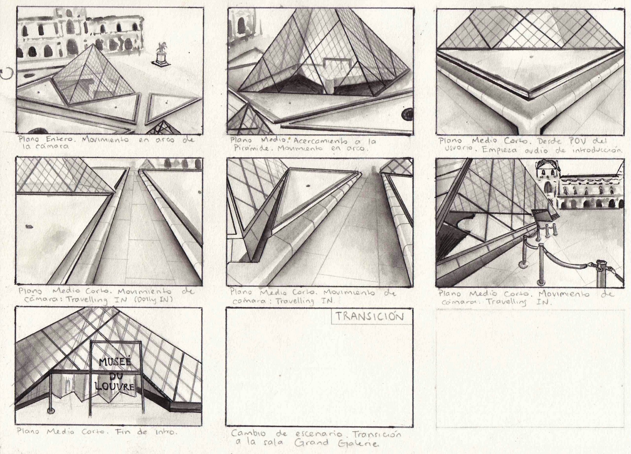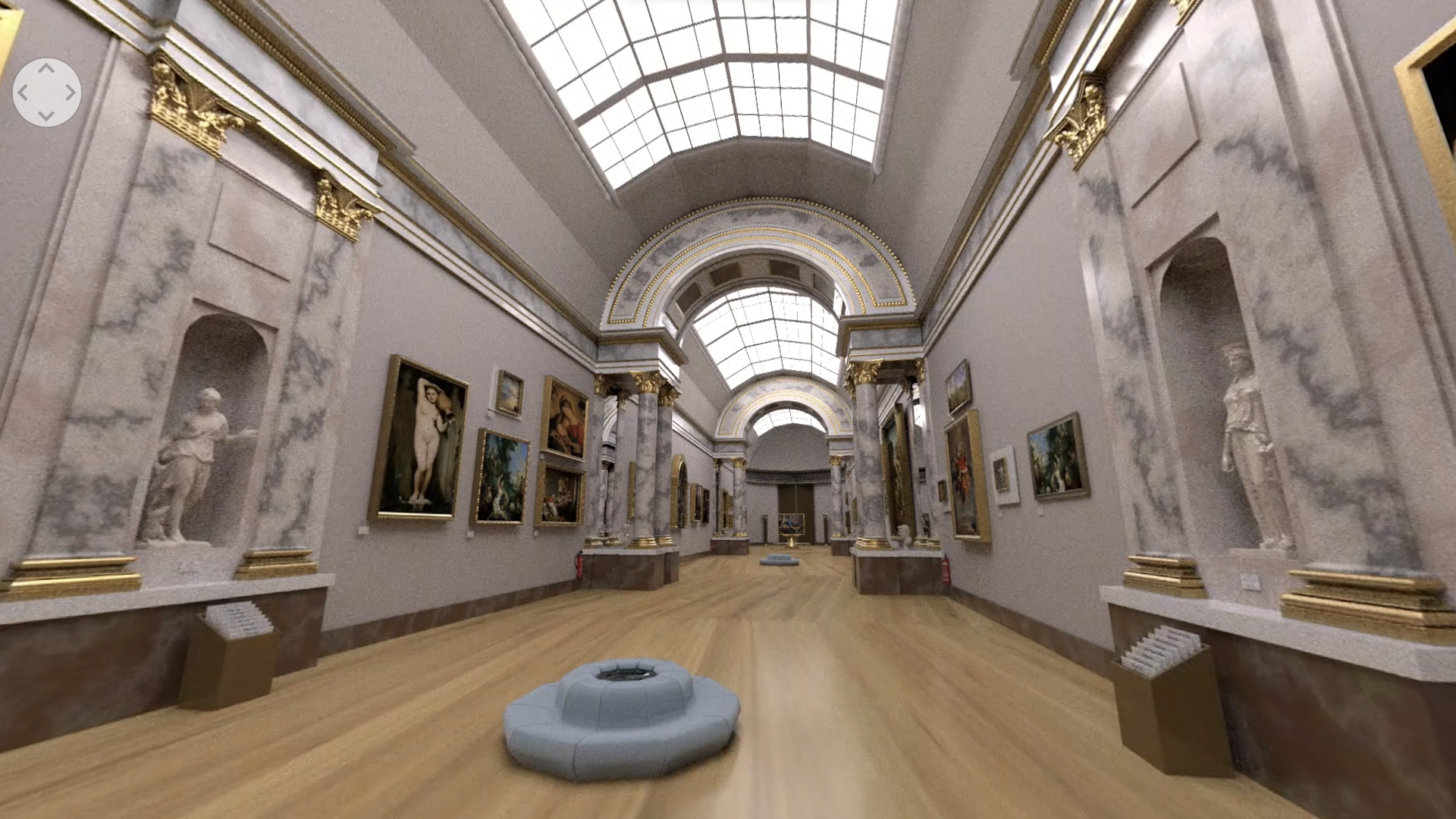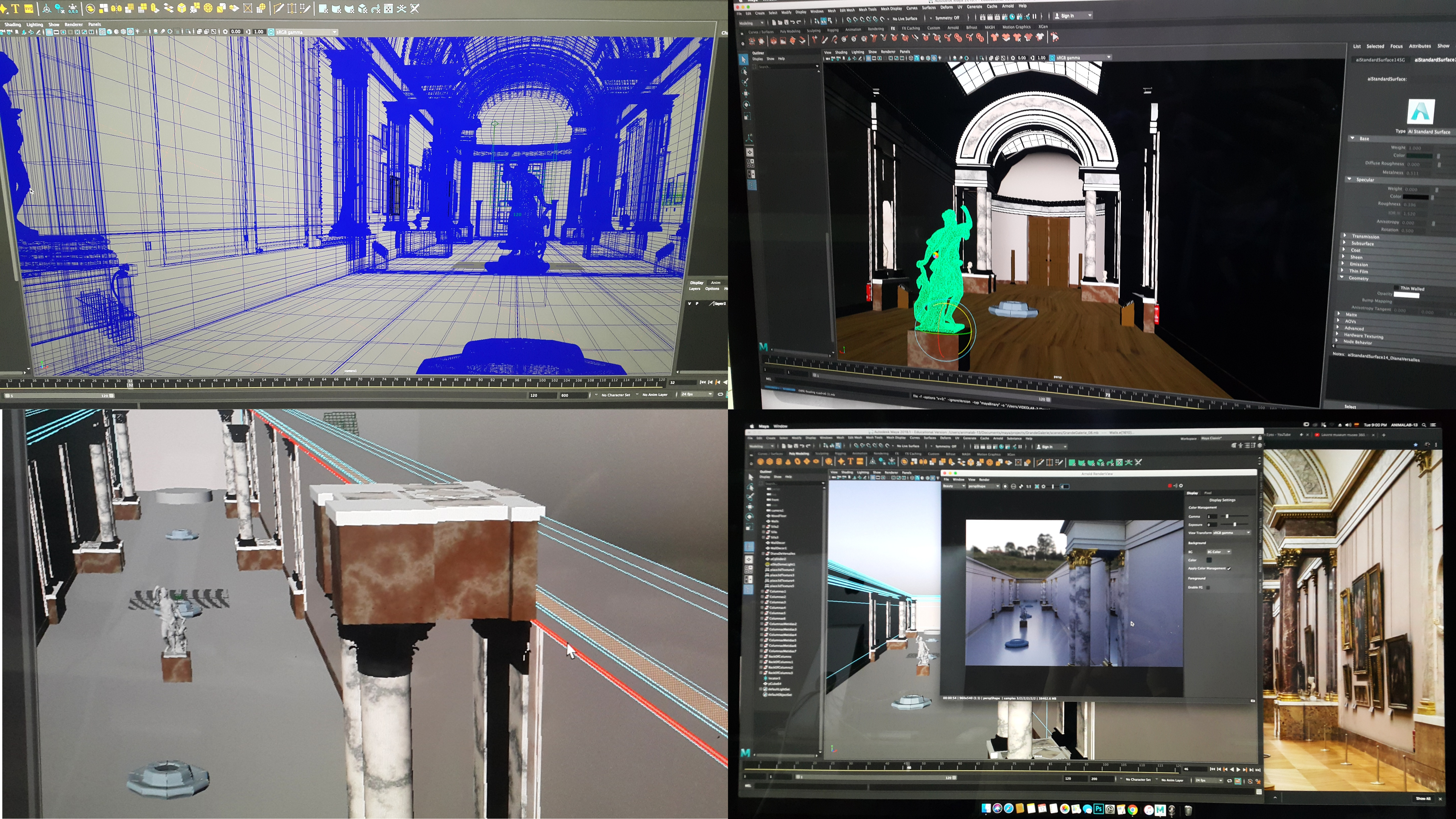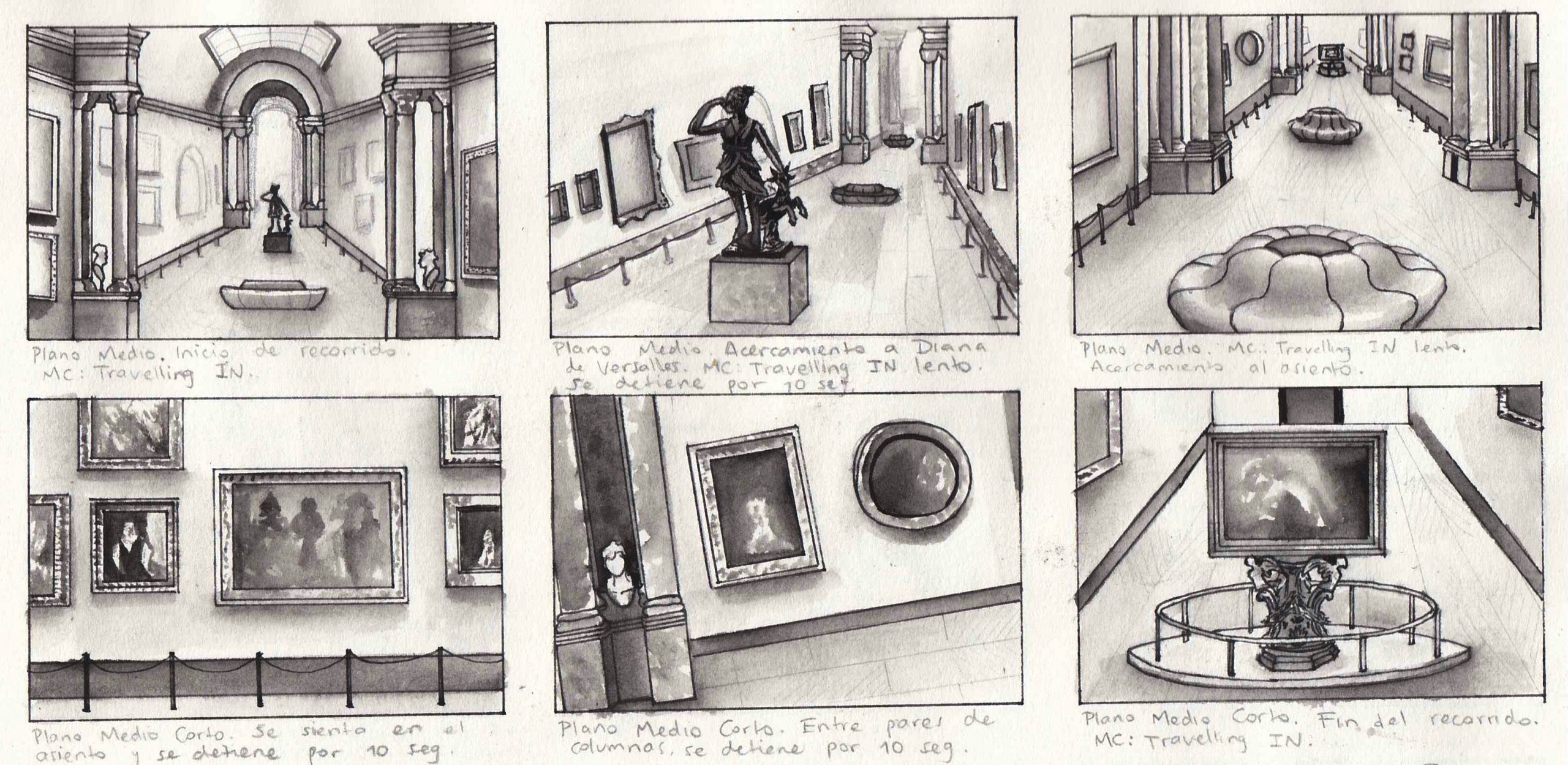 I was in charge of elaborating the storyboards for the experience, both inside the Grande Galerie and outside of the museum, and modelling, texturing and rendering the inside structure and objects of the gallery, including the wall/roof structure and details, columns and unique chairs, as pictured below.
